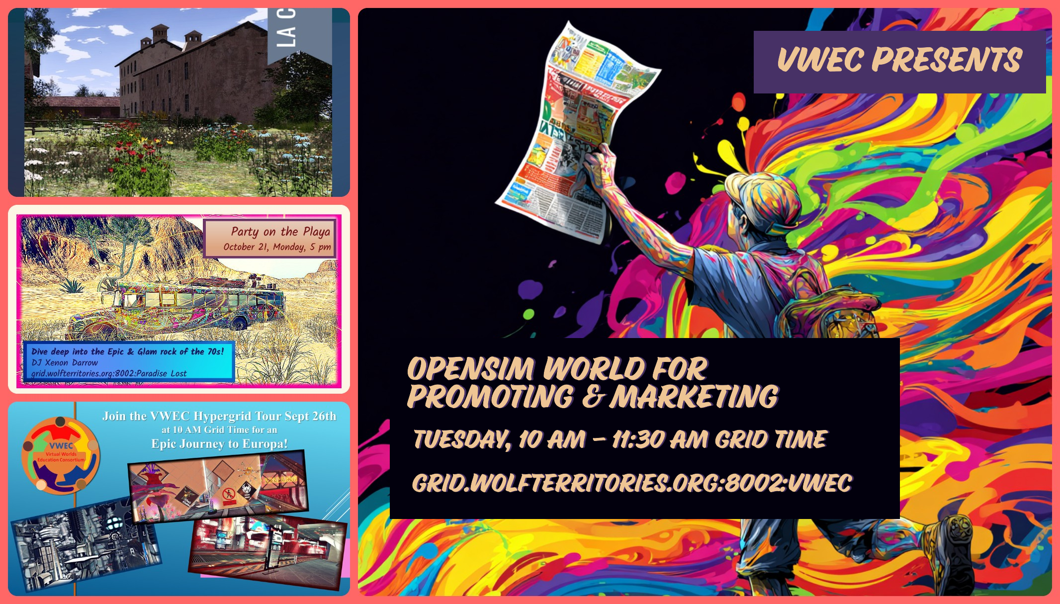 | VWEC Presents - OpenSim World for Promotion & Marketing | VWEC | NOTE: It is very important to do the prework: Open your account Tutorials: https://sites.google.com/view/oswtutorials/home Today is the day! VWEC Presents - OpenSim World for Promotion & Marketing March 10, Tues, 10 am grid time OSW is the primary means of promotions events and products for OpenSim. You will: - Open an account on OSW - Create your profile - Review the steps for adding a beacon - Learn to add gold to your account for promotions - Review the process for using the calendar - Assess if you need a paid profile grid.wolfterritories.org:8002:VWEC | 2026-03-10 10:00:00 | ![]() | Click Here | Xenon Darrow |