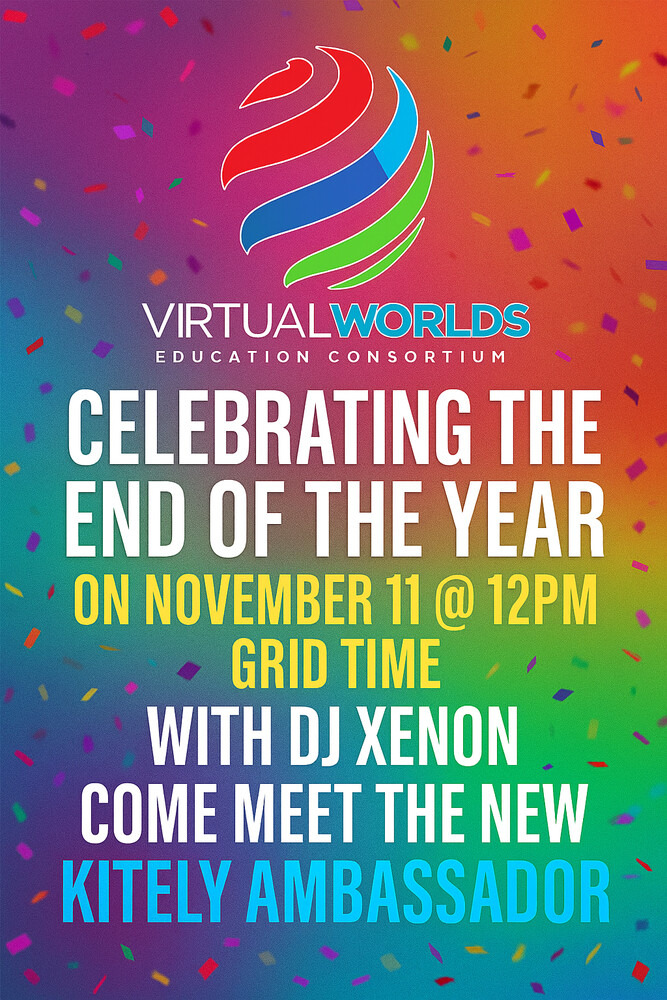| VWEC Closing Party: Let’s Wrap Up the Year in Style! ? | VWEC | Join us as the Virtual Worlds Education Consortium (VWEC) celebrates another amazing year of creativity, collaboration, and innovation in virtual education! Date: November 18 Time: 11 AM - noon Grid Time Featuring: DJ Xenon spinning the beats that bring the grid to life Location: Come dance, laugh, and connect with friends old and new as we toast to the future. And don’t miss the chance to meet the new Kitely Ambassador! It’s more than a party. It’s a celebration of everything we’ve built together! | 2025-11-18 11:00:00 | ![]() | Click Here | Xenon Darrow |