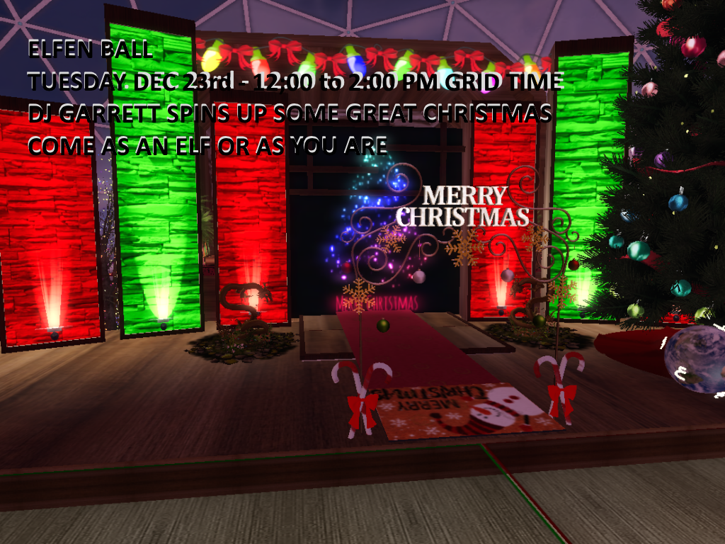 | The Elfen Ball | The Glendale Sim in Wolf Territories Grid | Tuesday Dec, 23 rd from 12:00 to 2:00 pm Grid Time - hop://grid.wolfterritories.org:8002/Glendale%20Estate/556/803/1587 Held at the Glendale Special Event Stadium in the Wolf Territories Grid DJ Garrett Spins Christmas Tune and Others for some Fabulous Dancing. Great People, Great Tunes at a Great Place | 2025-12-23 00:00:00 | ![]() | Click Here | Garrett Glendale |