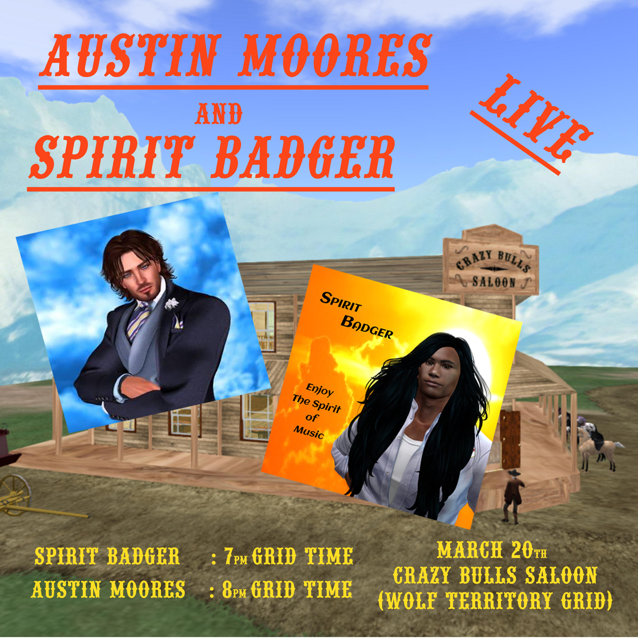 | Austin Moores Live | Great Plains | Austin Moores is singing Live at the Crazy Bulls Saloon at 8pm Grid Time. Join the fun and enjoy his live tunes. Come and enjoy the evening in good ole western saloon atmosphere. Take the coach to hop://grid.wolfterritories.org:8002/Great%20Plains/128/128/23. | 2026-03-20 20:00:00 | ![]() | Click Here | Joe Elder |