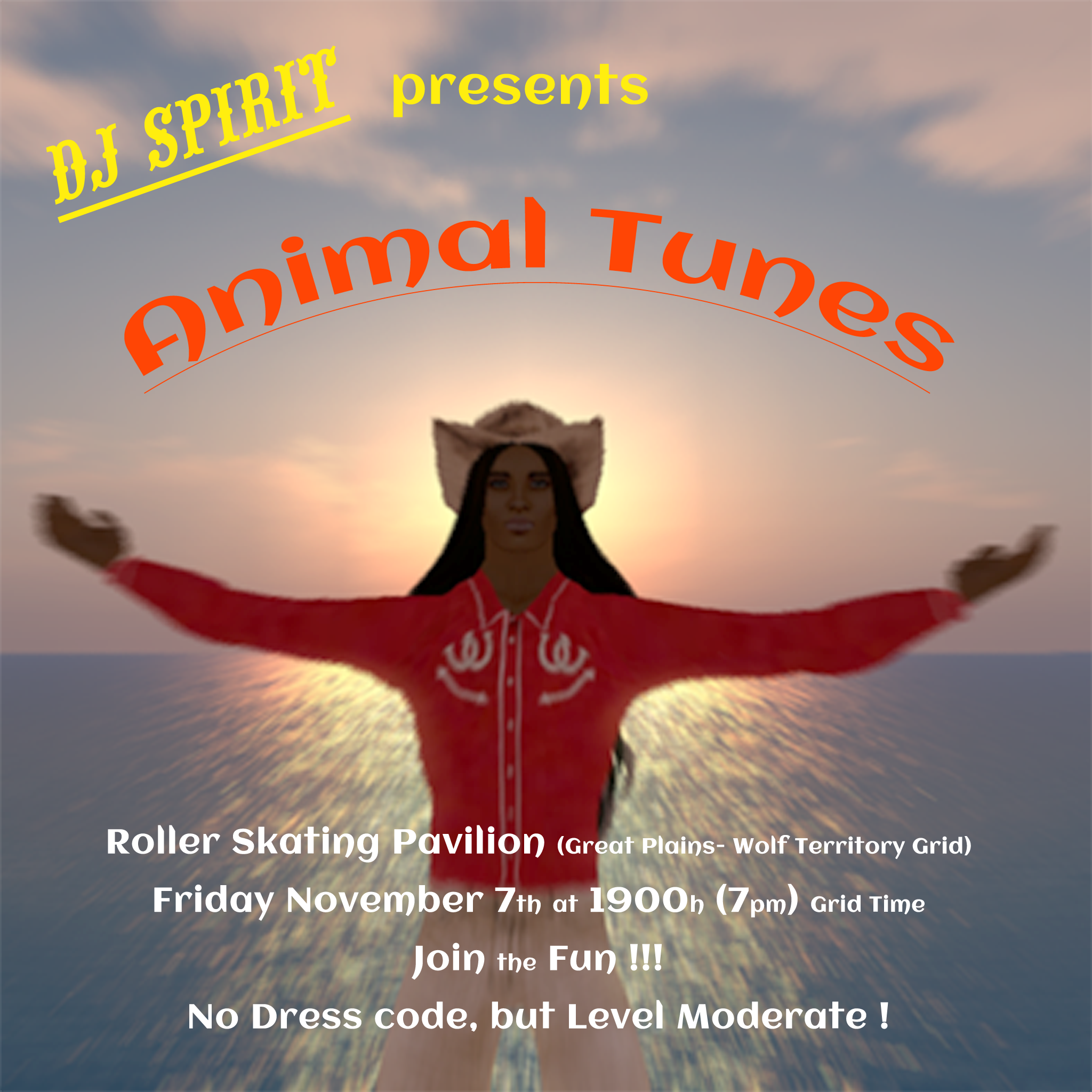 | DJ Spirit- Animal Tunes | Great Plains | It´s Party Time!!! DJ Spirit is spinning 2 hours of Animal Tunes from all kind of music genres this Friday starting at 1900h. Join us at the Great Plains Skating Pavilion for Fun and Great Music. No Dress Code, but Level is Moderate. Take the coach to hop://grid.wolfterritories.org:8002/Great Plains/128/128/23. | 2025-11-07 19:00:00 | ![]() | Click Here | Joe Elder |
