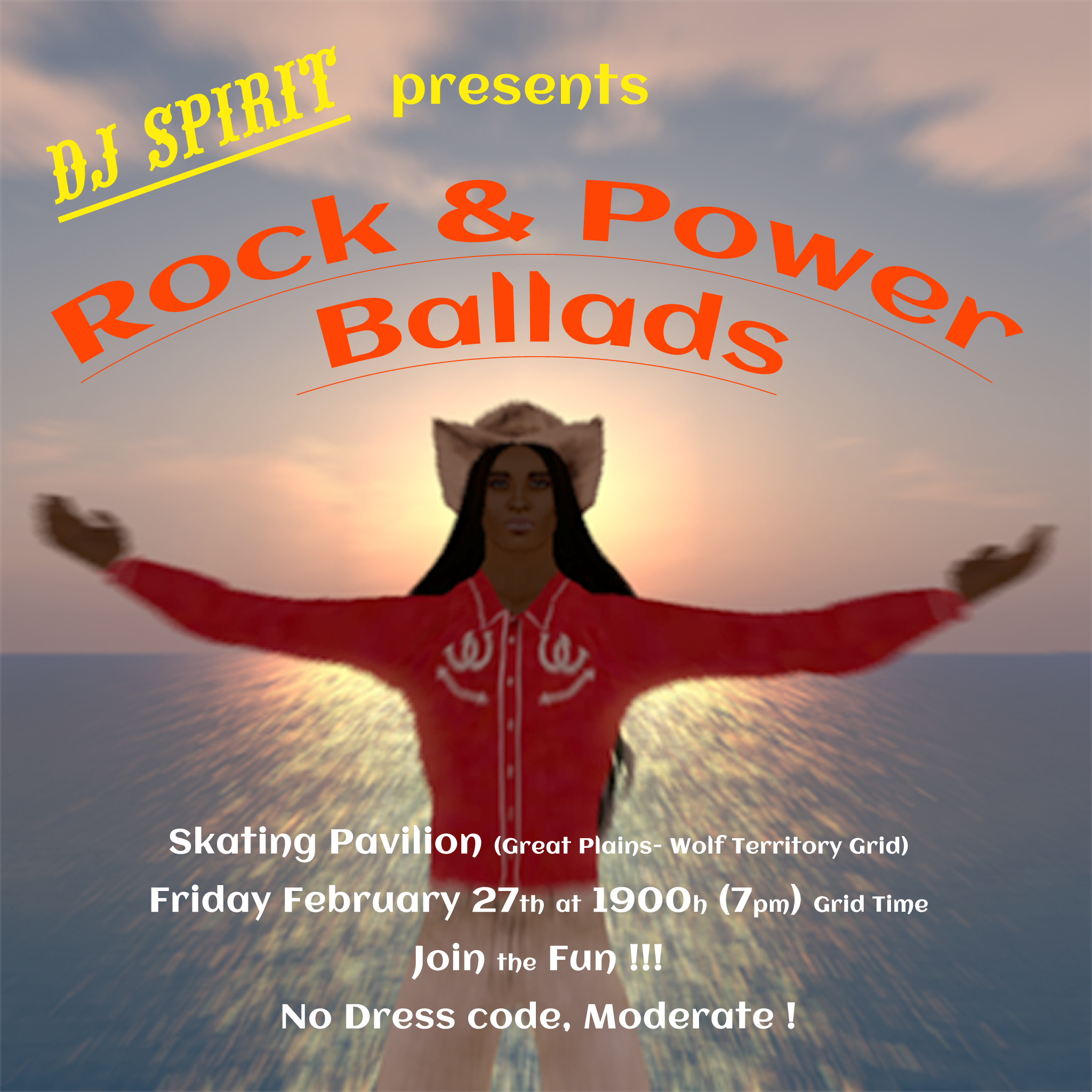 | DJ Spirit- Rock & Power Ballads | Great Plains | It“s Party Time!!! DJ Spirit is spinning 2 hours of Rock & Power Ballads this Friday starting at 1900h. Join us at the Great Plains Skating Pavilion for Fun and Great Music. No Dress Code, but Level is Moderate. Take the coach to hop://grid.wolfterritories.org:8002/Great Plains/12Animal Tunes8/128/23. | 2026-02-27 19:00:00 | ![]() | Click Here | Joe Elder |