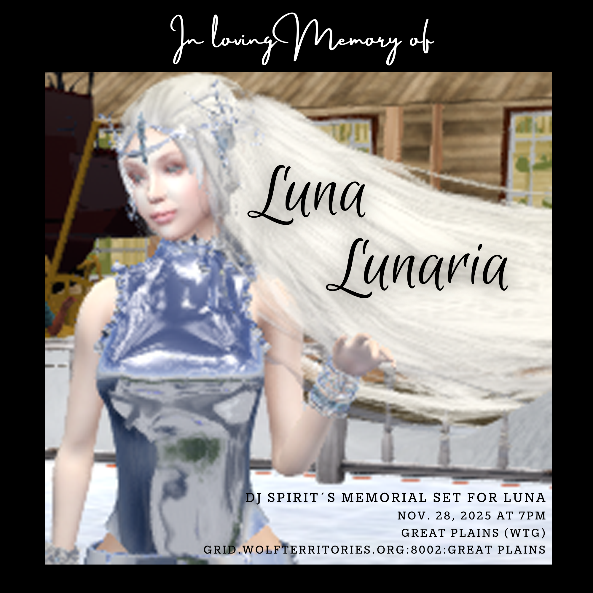 | DJ Spirit- Luna Lunaria Memorial Set | Great Plains | In Loving Memory of Luna Lunaria. DJ Spirit is spinning 2 hours of Lunaยดs Favorite Tunes and her Requests on Friday starting at 1900h. Join us at the Skating Pavilion in her Memory. Take the coach to hop://grid.wolfterritories.org:8002/Great Plains/128/128/23. | 2025-11-28 19:00:00 | ![]() | Click Here | Joe Elder |
