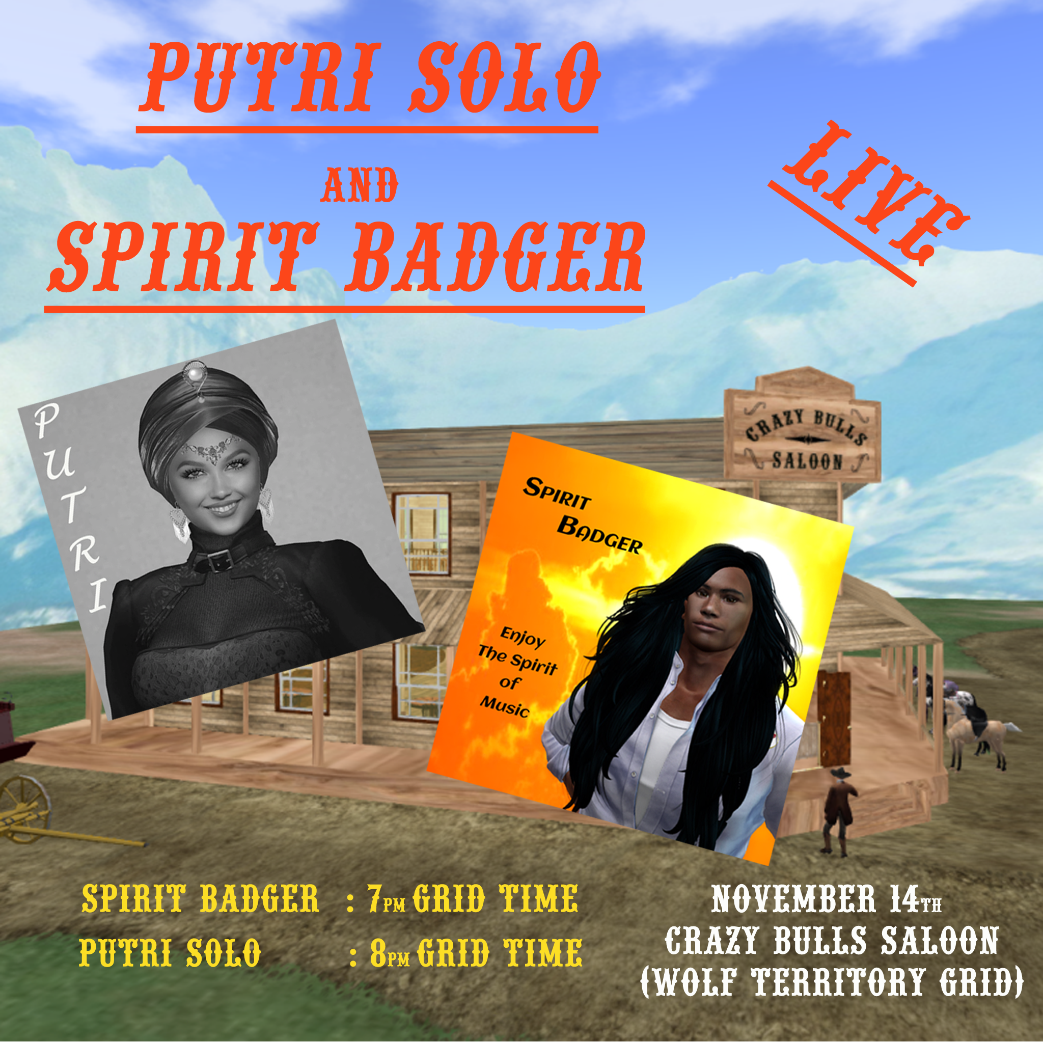 | Putri Solo Live | Great Plains | Putri Solo is singing Live at the Crazy Bulls Saloon at 8pm Grid Time. Join the fun and enjoy her live tunes. Come and enjoy the evening in good ole western saloon atmosphere. Take the coach to hop://grid.wolfterritories.org:8002/Great%20Plains/128/128/23. | 2025-11-14 20:00:00 | ![]() | Click Here | Joe Elder |