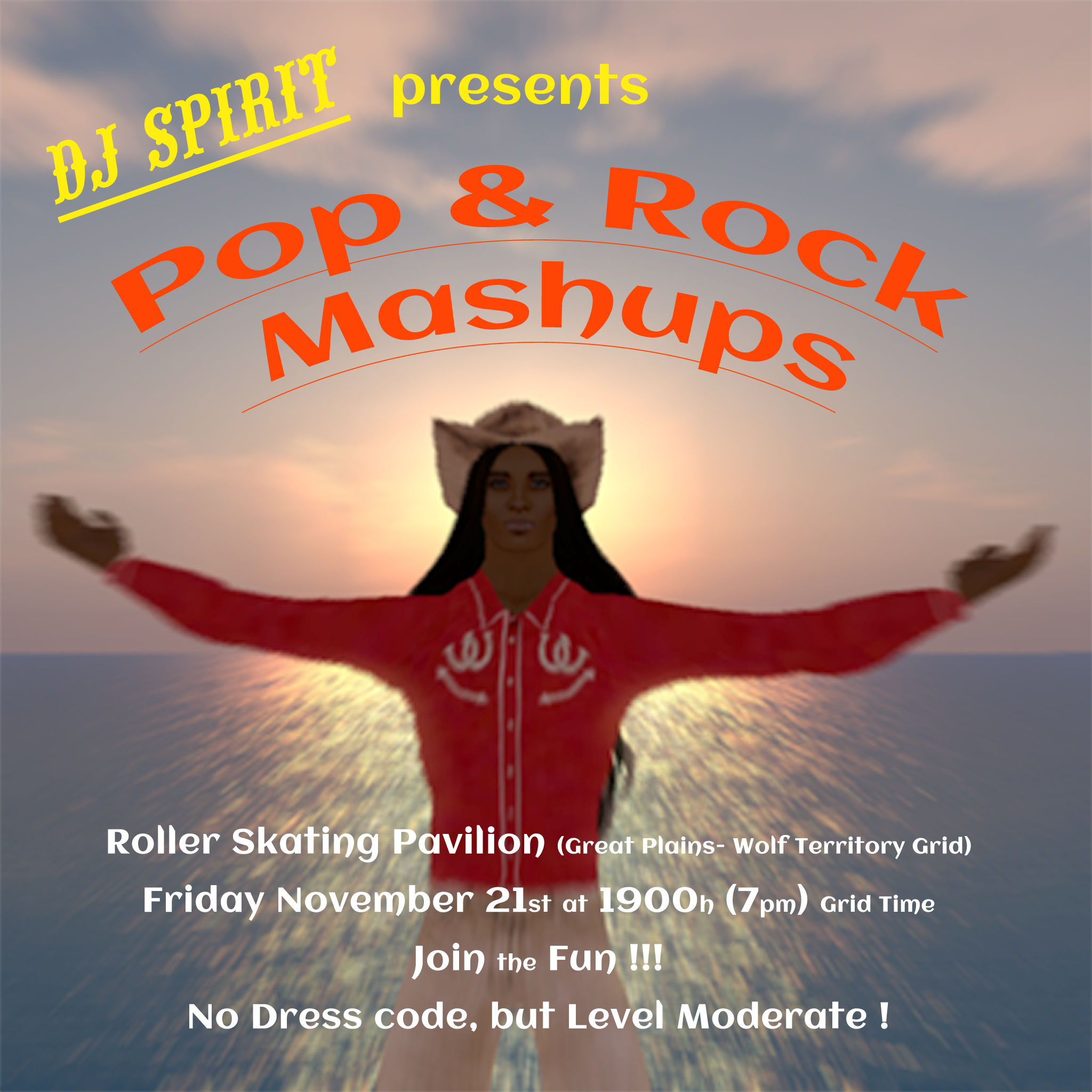 | DJ Spirit- Pop & Rock Mashups | Great Plains | It´s Party Time!!! DJ Spirit is spinning 2 hours of Pop & Rock Mashups this Friday starting at 1900h. Join us at the Great Plains Skating Pavilion for Fun and Great Music. No Dress Code, but Level is Moderate. Take the coach to hop://grid.wolfterritories.org:8002/Great Plains/12Animal Tunes8/128/23. | 2025-11-21 19:00:00 | ![]() | Click Here | Joe Elder |