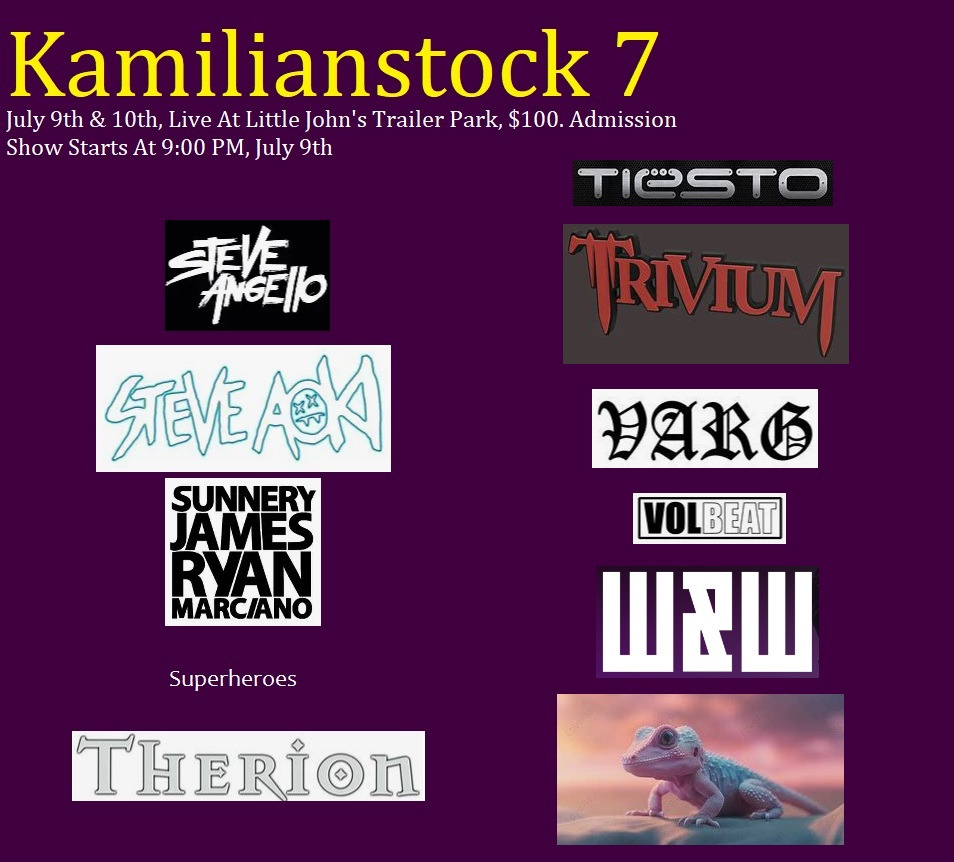 | Kamilianstock 7 | Hempstein Island | Steve Angello, Steve Aoki, Sunnery James And Ryan Marciano, The Superheroes, Therion, Tiesto, Trivium, Varg, Volbeat & W&W Live | 2026-07-09 18:00:00 | ![]() | Click Here | Kammy Gearz |