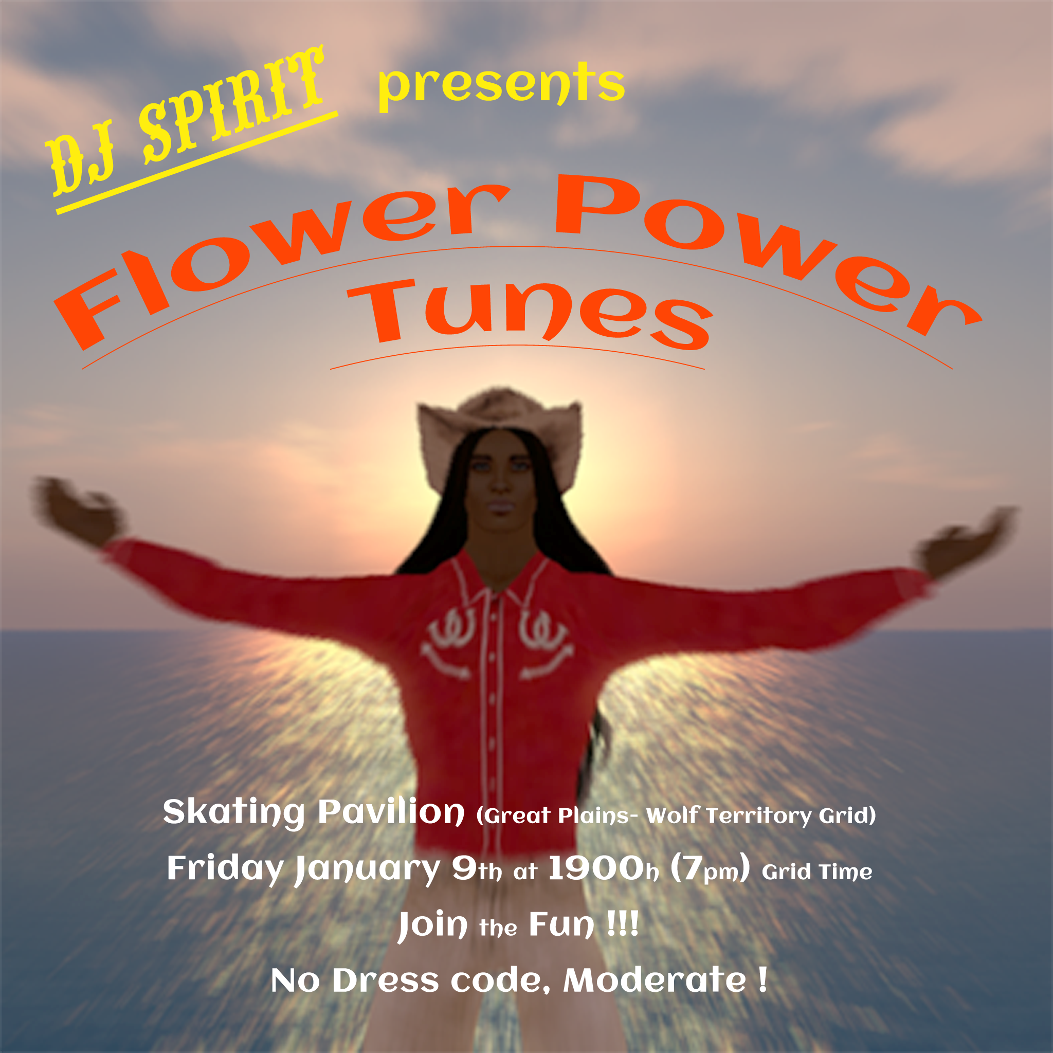 | DJ Spirit- Flower Power Tunes | Great Plains | It´s Party Time!!! DJ Spirit is spinning 2 hours of Flower Power Tunes this Friday starting at 1900h. Join us at the Great Plains Skating Pavilion for Fun and Great Music. No Dress Code, but Level is Moderate. Take the coach to hop://grid.wolfterritories.org:8002/Great Plains/12Animal Tunes8/128/23. | 2026-01-09 19:00:00 | ![]() | Click Here | Joe Elder |